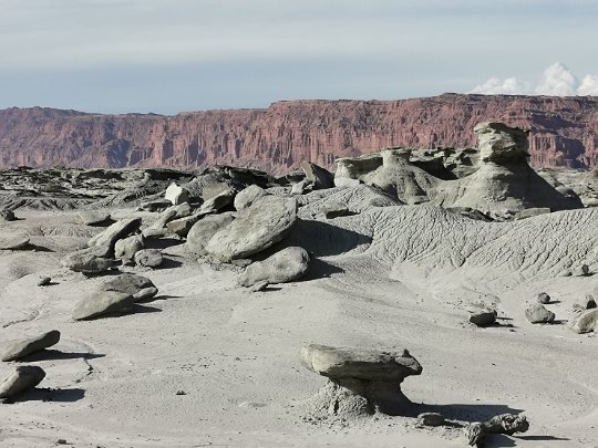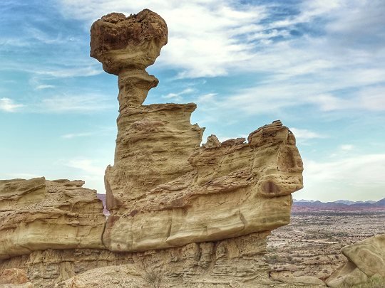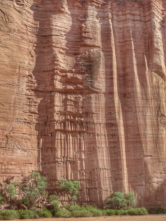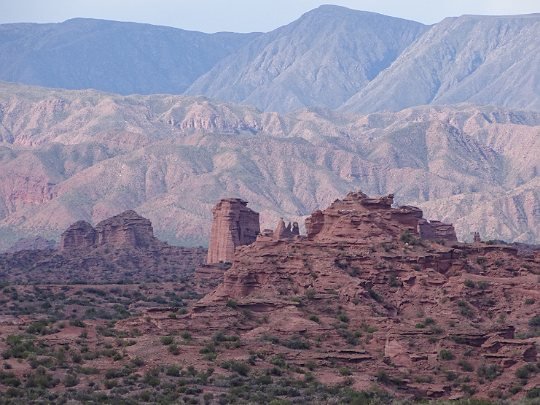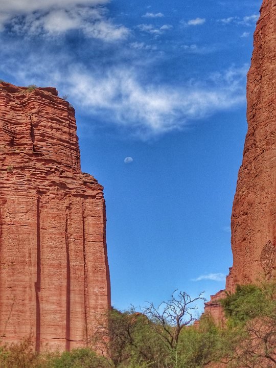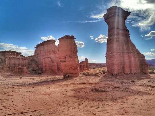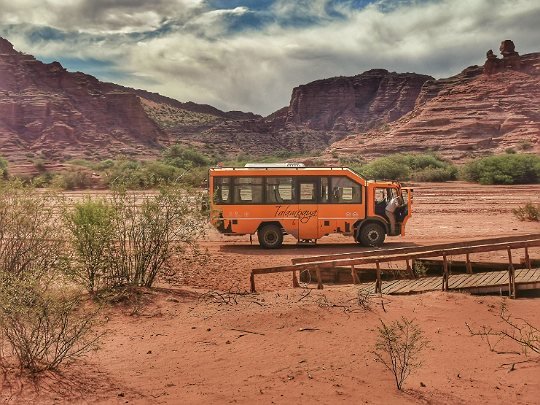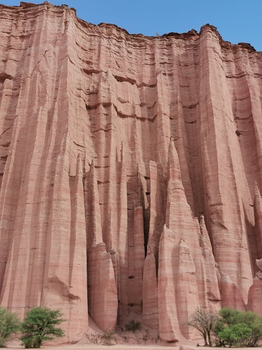 Talampaya beeindruckt durch seine atemberaubenden rötlichbraunen Felsformationen in der staubigen Wüstenlandschaft. Im Lauf der Jahrtausende hat die Erosion sowie Wind und Wetter in der rauen Landschaft ein steinernes Kunstwerk neben dem anderen im roten Sandstein entstehen lassen. Auf einer Fläche von 215’000 Hektar formieren sich tausende spektakuläre Formen. Zig Meter hohe senkrechte Steilwände, die wie aus rot leuchtenden Orgelpfeifen geformt scheinen, ragen in den kobaltblauen Himmel, einzelne bizarr geformte Säulen und Pfeiler mit den skurrilsten Ausprägungen stehen in der Gegend herum. Der berühmteste Teil des Talampaya ist ein 3 Kilometer langer Canyon, der auf beiden Seiten von 150m hohen Felswänden begrenzt wird.