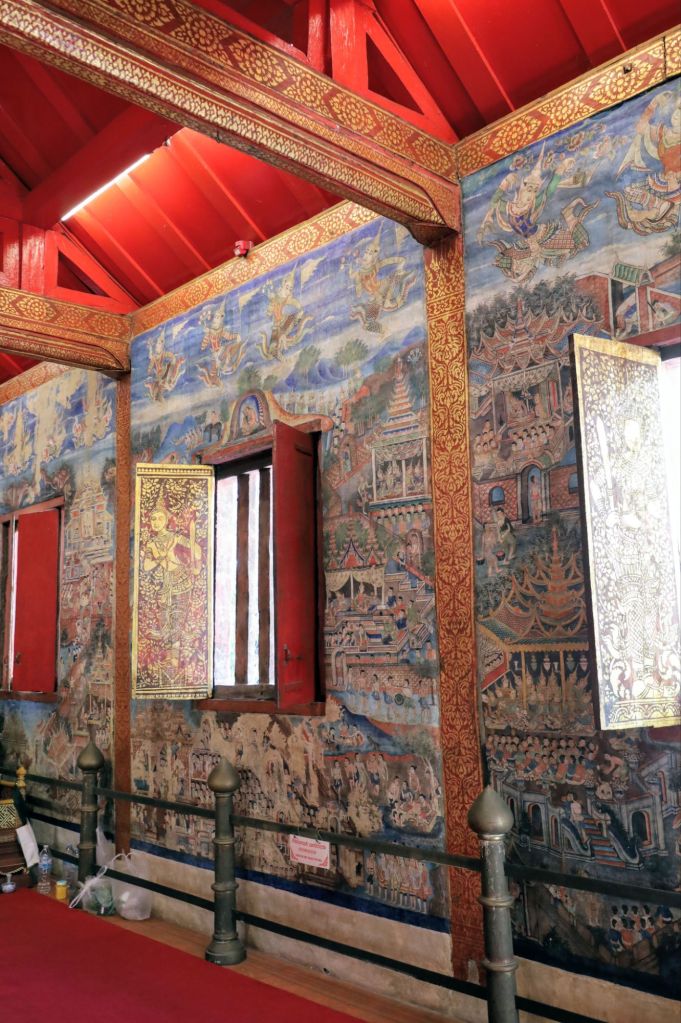 Der Tempel ist ein Meisterwerk des Lanna-Stils – der traditionellen Architektur Nordthailands. Die goldenen Dächer, die aufwendig geschnitzten Holzelemente und die farbenprächtigen Wandmalereien sind atemberaubend. Überall glänzt und funkelt es in der Vormittagssonne.