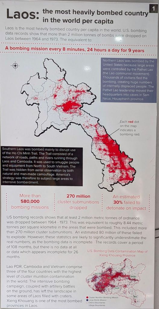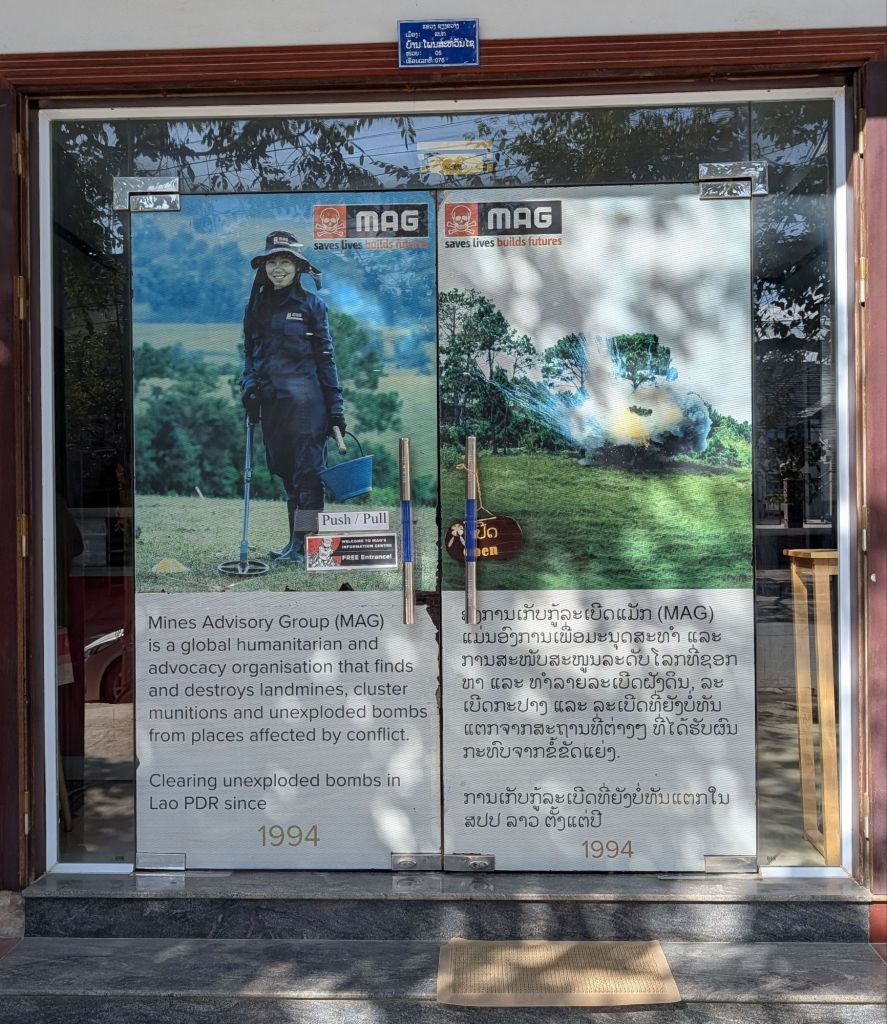 Es ist zutiefst bedenklich, was sich Menschen gegenseitig antun. Dass Laos das am meisten verbombte Land der Welt ist (im Verhältnis zur Einwohnerzahl), war eine Information, die uns in dieser Deutlichkeit neu war. Zu sehen, wie viele Blindgänger (UXO) heute noch das Leben der Menschen bedrohen, rückt die Schönheit der Landschaft in ein ganz anderes, ernsteres Licht. Es macht ehrfürchtig vor der Resilienz der Laoten, die trotz dieser Last so freundlich geblieben sind.