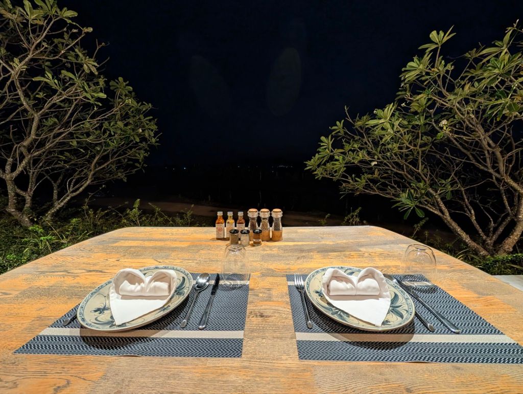 Exklusivität: Da wir aktuell die einzigen Gäste sind, genossen wir am Abend ein Privat-Dinner in absoluter Ruhe – ein krasser Gegensatz zum wuseligen Vietnam!