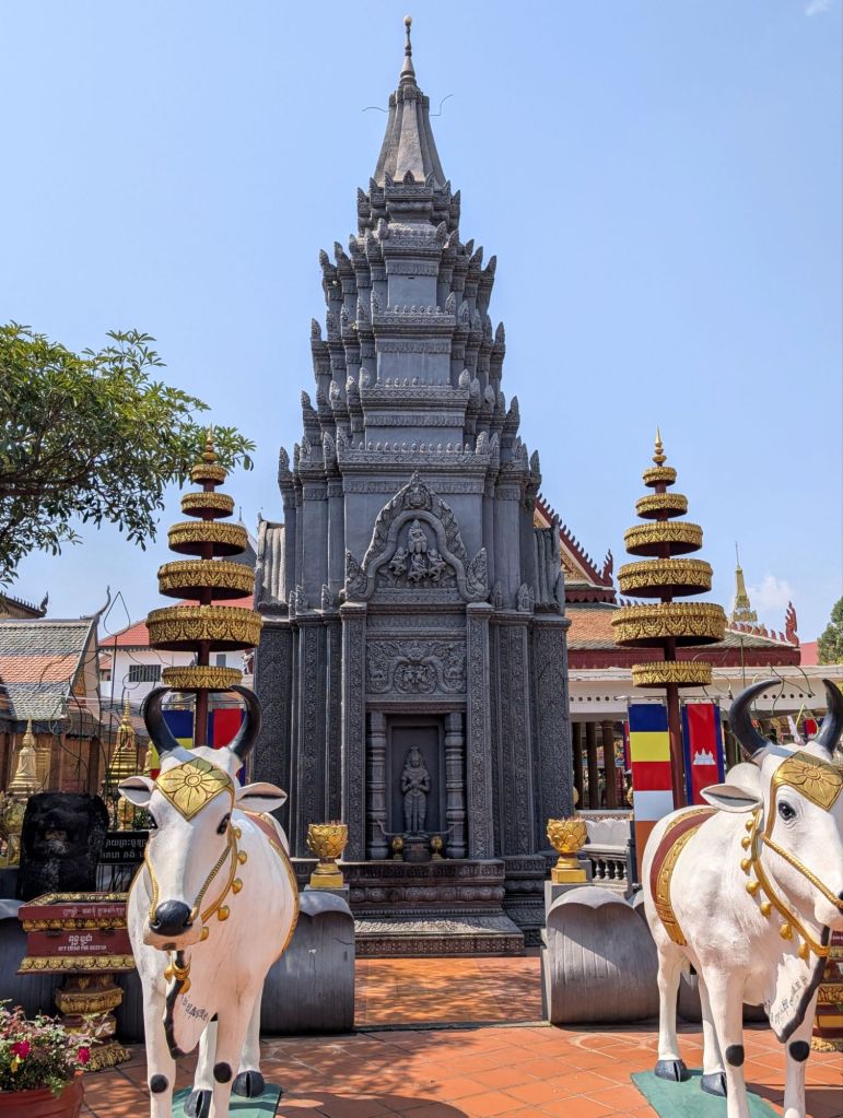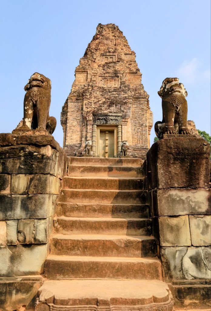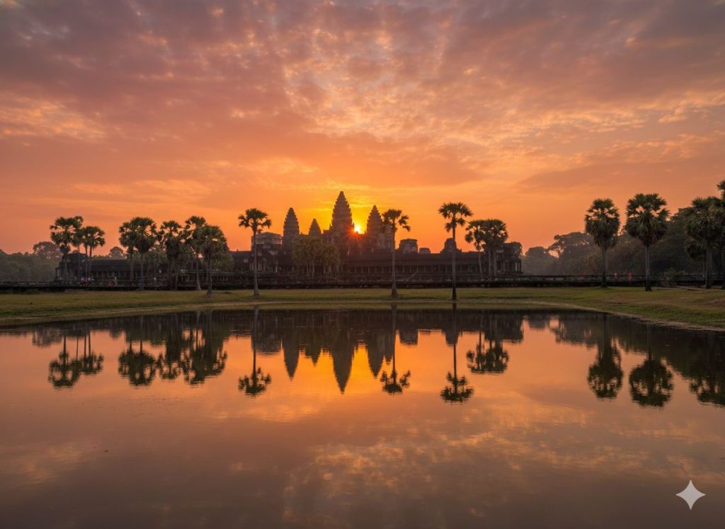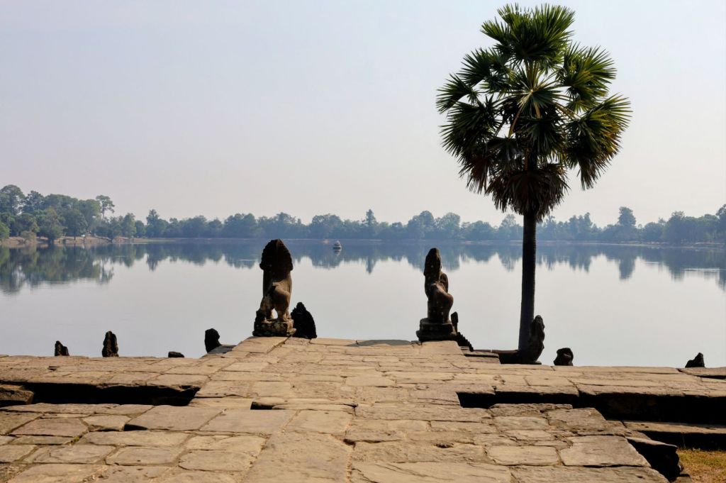 Angkor Wat – Das Abbild des Universums: Er ist der einzige Tempel in Angkor, der nach Westen ausgerichtet ist. In der Khmer-Kultur ist Westen die Himmelsrichtung des Todes, weshalb man glaubt, dass Angkor Wat ursprünglich als Grabmal für König Suryavarman II. geplant war. Die fünf Türme symbolisieren die Gipfel des heiligen Berges Meru.